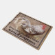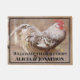 Un gallo blanco y negro adorna esta divertida alfombra de puertas que dice: "Bienvenidos a nuestra primicia".