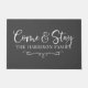 Una moderna alfombra de puertas caligráficas que te hará sentir bien. Un gran regalo para recién casados o nuevos propietarios de casas, nuestro personalizado viene y se queda doormat en elegantes y duraderas características grises "Come and Stay" en un moderno y elegante guión de caligrafía escrita a mano. Personalice su nombre familiar con letras blancas clásicas. Diseñado para ti por Blackberry Boulevard.