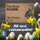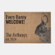 Esta sencilla, minimalista y rústica alfombra de bienvenida de conejo negro es una manera fácil de saludar a todos los que vienen a su casa o a sus negocios. Las palabras "Cada Bienvenida Conyugal", su apellido o nombre comercial, y la fecha fijada son personalizables a su gusto. Perfecto para la primavera, esta alfombra ofrece a los huéspedes o clientes de la entrada una cálida bienvenida con un diseño único y encantador. **Aviso importante: Esta alfombra está diseñada para entrar por el interior o en un porche o patio cubierto. Para una alfombra exterior más robusta, por favor encuentra la estera de "coco" disponible también en mi tienda: https://www.zazzle.com/rustic_modern_black_bunny_rabbit_outdoor_mat-256325452800019382 . ¡Esta estampa fue creada a partir de mi fotografía de la naturaleza de un conejito que visitó frecuentemente mi patio trasero el año pasado! Nos alegramos de darle la bienvenida a nuestro jardín. Foto de Amanda Renee, CtrlZ Digital Designs 2023