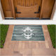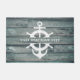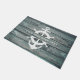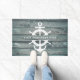 Doormat náutico de barca en madera gris turquesa impresa leyendo el nombre de tu barco personalizado rodeado por un pozo y ancla de un barco.