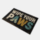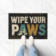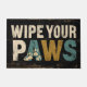 Esta encantadora y rústica imagen presenta un cartel de estilo vintage con el mensaje "WIPE YOU PAWS". El fondo tiene una textura de madera oscura angustiada y templada. La letra está en una mezcla de letras en negrita y en mayúsculas, con "WIPE TU" en un color de color blanco roto y la palabra "PAWS" en una mezcla de verde azulado y oro, con sutiles gráficos de la huella de pata incrustados en las letras. Este gráfico presenta un ambiente cálido y agradable para los mascotas y es perfecto para una decoración casera, o para cualquier diseño que abarque una estética acogedora y de moda de campo.