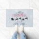 Un doormat de Navidades festivos. Un sutil fondo gris con copos de nieve. Fancy trendy lettering, que dice: Feliz Navidad y Feliz Año Nuevo. Con una silueta negra, Santa montando en su trineo siendo jalado por su reno volando por el cielo.