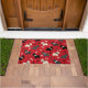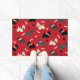 Cute black, gray and wheaten Scottie dogs wearing bows, with pawprints and dog bones on a red background.
