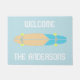 Bienvenido a los huéspedes con estilo con este felpudo personalizado que presenta un ilustracion de un patinaje de largo recorrido de estilo retro. El patinador azul claro, azul intenso y amarillo brillante, se sitúa sobre un fondo azul claro con un mensaje de bienvenida y tu nombre con letras blancas en negrita.