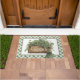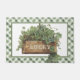 This whimsical St Patrick's Day door mat features a box of clover with the word "lucky" on the front. There is a coordinating green and white gingham border around the edge.