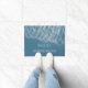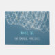 Pares azules de Cape Cod con gris de madera de deriva para un felpudo de color costero que le recuerda a sus invitados que se quiten los zapatos. Gracias es una acuarela azul brillante impresa en el centro.Luces de cadena impresas en pastas de enfoque suave.