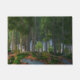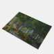 Una mesa de árboles en un soleado día de verano. Los árboles altos son altos y oscuros, pero los saplings de abajo tienen un nuevo y brillante crecimiento. Crecer a través de las hojas caídas es el verde, el rosa y el blanco del trébol y otras cubiertas de tierra.