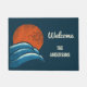 Crea una estera de bienvenida personalizada que es perfecta para tu casa de playa o añade un toque de estilo surfista a casas y apartamentos que están lejos del océano con esta fresca alfombra de bienvenida personalizado. Esta alfombra de puerta presenta un ilustracion retro de olas estrelladas en tonos azules con un sol naranja brillante por encima y siluetas de gaviotas colocadas contra el sol. El gráfico tiene un estilo angustiado que le da un aspecto antiguo y gastado y se sitúa sobre un fondo azul marino. Las letras en color crema están listas para que usted las personalizar con su propio nombre.