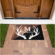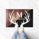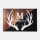 Profundamente, ricos, tablones de madera marrones rústicos del granero con una silueta blanca quebradiza de las astas de los ciervos, diagonal moderna negra, y su letra personalizada del apellido y del monograma.