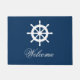 Elegante alfombra de personalizado náutico azul y blanco de la Marina. Haga su propio personalizado monogramado de puerta interior / exterior con color de fondo personalizado y texto. Añade tu propio mensaje de bienvenida, apellido, apellido, carta inicial o cita graciosa. Idea de regalo para nueva casa / hogar, lugar de boda, tienda, tienda, oficina de empresa, negocios, etc. Elegante escritura tipografía del logo del casco de barco blanco. Plantilla personalizable con el icono de la rueda del buque. Crea tu propia estera de entrada / alfombra para la puerta delantera / entrada o el vestíbulo. Decoración/decoración de la casa del personalizable para su casa de playa. Idea de regalo marítimo para aficionados a la navegación/navegación en barco, pareja, marinero, capitán de barco o recién casados.