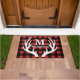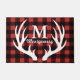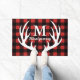 Doormat rústico de la tela escocesa del control del búfalo rojo y negro con una silueta blanca quebradiza de las astas de los ciervos y su letra personalizada del apellido y del monograma.