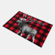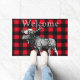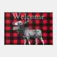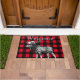 Modelo intrépido de la tela escocesa del control del búfalo en rojo y negro con un ilustracion blanco y negro detallado y la palabra "recepción" de los alces en una fuente abierta blanca de la cara en el centro superior. ¡Este doormat es grande para una cabina o un campista!