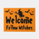 Un lindo felpudo de Halloween con una bruja voladora, sus familiares y voladores murciélagos que dicen: Bienvenidos otros brujos.