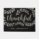 Personalized welcome mat in chic and durable black features "thankful" in hand lettered calligraphy script, surrounded by leaves and branches. Personalize with your names or family name along the bottom for a perfect way to add autumn cheer to your doorstep this Thanksgiving season.
