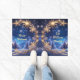 La temporada de los Navidades - una época llena de asombro, alegría, esperanza, expectativas y sorpresas. Este felpudo presenta un torbellino dorado de copos de nieve en el cielo azul de la noche sobre el bosque invernal. Maravilloso felpudo para la temporada de Navidades - cambiar/eliminar texto!