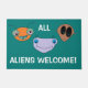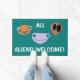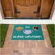 Esto es una diversión y el doormat colorido con tres extranjeros lindos diseña y el refrán "TODA LA RECEPCIÓN de los EXTRANJEROS!"