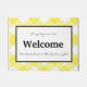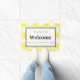 La estera de puerta de cierre se muestra en la impresión de color amarillo gingham y tiene un fondo blanco con borde negro y texto. El texto dice "Cada día que nos levantamos", "Bienvenidos" en negrita en el centro y "elegimos servir al Señor nuestro DIOS". Imagen de una paloma detrás de la palabra 'Bienvenida'. Personalizar esta alfombra o compra como está.