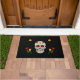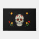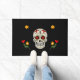 El doormat colorido muestra un cráneo con corazones en los ojos, flores y una cruz en la frente. El fondo es negro, con flores amarillas y rojas. Utilice este patrón gótico de cráneo de azúcar para el Día de los Muertos, la festividad de Halloween o todos los días. Celebrar las vidas de las personas queridas que han fallecido, en el Día de los Muertos, o Día de los Muertos, en octubre/noviembre alrededor de Halloween.