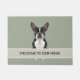 Aquí hay una linda alfombrilla de auto de bienvenida de Boston Terrier para la entrada a su casa con una plantilla de banner de mensaje de bienvenida que puede personalizar con su propio texto o mensaje personalizado.