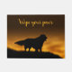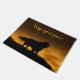 El golden retriever silueteado en una salida del sol de oro o la puesta del sol que aconseja para limpiar sus patas persigue la estera de puerta de los amantes