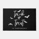 Recibe a los huéspedes con espíritu de Halloween utilizando este moderno felpudo. El diseño presenta Trick o Treat en una tipografía de escritura blanca y nítida, con siluetas de murciélago juguetón contra un fondo negro audaz. Un área de texto personalizable bajo el diseño le permite añadir un nombre familiar o un mensaje de bienvenida personalizado, lo que lo convierte en un toque único y festivo para su entrada durante la temporada espeluznante.