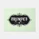 Trumpet en texto decorativo contra un emblema blanco o negro es un regalo único para músicos de bronce, profesores y estudiantes de banda de jazz, conciertos y bandas de marcha.