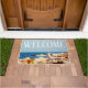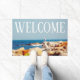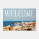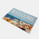 Fotografía de una gaviota parada en una gran oscilación en una costa rocosa, con vistas al océano Atlántico azul. Este felpudo tiene impreso "BIENVENIDA" en el cielo de la fotografía en una gran fuente blanca. Derechos reservados ©2018 Kimberly J Tilley.