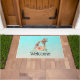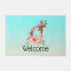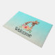 Un felpudo de bienvenida con un lindo dibujo en acuarelas de una madre y una jirafa de bebé. La jirafa madre está descansando su cabeza sobre la jirafa del bebé, amorosa y adorable. un ramo de flores color agua rosa, amarillo, verde y colocado debajo de este querido par. Fondo degradado creado con un delicado color azul turquesa que se funde en un color marrón arenoso.