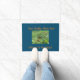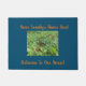 Una alfombra de 18 "x24" Verde azulada oscura, con puerta de color, con una foto, de una hermosa mariposa monarca, tendida en la hierba, sobre ella, con un Naranja medio, color. Texto, que te permite personalizarlo con "¡Tu nombre de familia aquí!", (arriba), y también dice "¡Bienvenidos a nuestra casa!" (abajo).