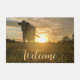 Este cálido y acogedor doormat de bienvenida tiene la imagen de una vaca parado en un pasto en las praderas de Alberta con el sol abrasador detrás de la silueta de vaca. La palabra "Bienvenidos" se imprime en la parte inferior en color marrón.