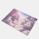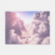 Un globo aerostático solitario flota a través del cañón rosa pálido entre nubes imponentes. El sol, bajo en el cielo pastel, brilla detrás del borde de las nubes, enviando corrientes de luz brillante hacia el espectador.