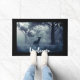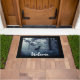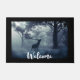 Un felpudo de bienvenida con la foto de un venado de regal con cuerdas paradas en un bosque oscuro entre árboles iluminados por el sol. Nieve por todas partes.