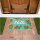 Bonito y vibrante cactus de pera espinosa con flores naranjas y un fondo azul con un "hola" blanco con letras a mano en el guión. Este felpudo grita divertido, además está muy de moda, es genial para el verano. ¡y causaría una gran impresión a los huéspedes de su casa ya que son bienvenidos a su casa!