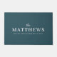Una elegante alfombra de puertas para festividades fotográficas con tu apellido, que aparece en la tipografía clásica, acompañada de una letra manuscrita en blanco, con un magnífico color verde verde azulado oscuro en el reverso. ¡Un diseño divertido y mínimo para destacar entre la multitud esta temporada de navidades!