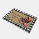 Bienvenido a sus visitantes Navidades con este doormat festivo y único de una casa de campo con un trineo negro vintage con un interior rojo y lleno de paquetes decorados con papel de verificación rojo, negro y búfalo blanco y negro. El fondo de la burlap está rodeado por un patrón de verificación de búfalos blancos y negros. Personaliza con tu propia información.