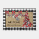 Bienvenidos a los visitantes de sus Navidades con este festivo y único doormat de una casa de campo con un vintage árbol de Navidad decorado con papel de verificación rojo, negro y búfalo negro. Hay una guirnalda de vegetación Navidad con la misma decoración y colores. El fondo de la burlap está rodeado por un patrón de verificación de búfalos blancos y negros. Personaliza con tu propia información.