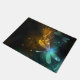 Vuelo de libélula resplandeciente, verde, dibujada de forma artística, con alas transparentes, verdes y amarillas sobre un brillante fondo nocturno con plantas de pantano y luciérnagas. Flauta de dragón resplandeciente.