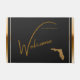 Welcome your guests in style with this classy doormat. The door mat features an elegant design with a black background and rich gold-colored Florida State map. The fancy script text reads "Welcome to our retirement home." The doormat is lovely for any Florida resident and makes a perfect gift for those with classic refined taste! Available in two sizes for your covered front porch, deck, lanai, laundry room, mud room, garage, or sunroom! Special design requests accepted.