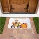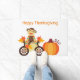 Whimsical bicicleta moto calcetín mono con calabaza grande naranja y personalizable texto de Acción de Gracias sobre fondo blanco