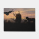 Dos lobos y un cuervo volador sobre un paisaje de silueta y una puesta de sol de nubes.