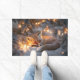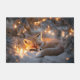 Experimente la magia del invierno con esta serena imagen de un zorro rojo durmiendo tranquilamente en la nieve, rodeado de brillantes luces de hadas y una linterna rústica bajo ramas de pino nevadas.