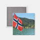 Imán de fotos de recuerdo con la bandera noruega en un ferry de autos entre Solvorn y Urnes en un fiordo en Noruega.