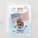 Una bonita y caprichosa tarjeta del 4 de julio con un mapache vestido con una gorra roja y azul inspirada en la bandera estadounidense. El mapache está tomando una bebida patriótica de una lata con paja, ambientada en un fondo azul claro con fuegos artificiales y una bandera norteamericana ondeando. El texto en negrita dice "4 de julio" en la parte superior y "Salvaje pero libre" en la parte inferior. Un alegre diseño para celebrar el Día de la Independencia con encanto y personalidad.