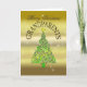 Una hermosa carta de Navidades con efecto oro. Un árbol verde abstracto coronado por una estrella brillante.
