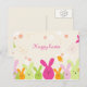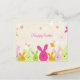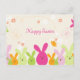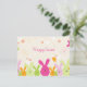 Esta linda postal de Pascua tiene un fondo de polka crema con mucho naranja suave y flores blancas por todas partes. Hay algunas mariposas volando en la parte superior. En la parte de abajo, aparecen algunas preciosas cabezas de conejito de colores vivos, rosa, verde y naranja. Feliz Pascua se escribe hacia arriba. Al fondo, hay el mismo patrón de polkadots crema. Se deja en blanco sin mensaje para que puedas escribirlo en casa o personalizar antes de comprarlo.