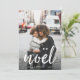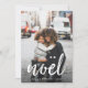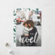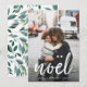 Envíe saludos de vacaciones a amigos y familiares en estilo moda invernal con nuestras elegantes tarjetas de fotos. Tu foto favorita vertical o orientada a retratos está cubierta con "noel" en tipografía dibujada a mano blanca, con tus nombres y el año bajo. Las tarjetas cambian a nuestro patrón de Abundancia de Invierno de follaje botánico verde exuberante sobre un fondo blanco crujiente.