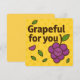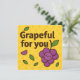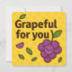 ¡Diga gracias de la manera más dulce con esta tarjeta "Grapeful for You"! Con adorables uvas sonrientes en un brillante fondo amarillo, este divertido juego de frutas es perfecto para expresar gratitud a amigos, familia, compañeros de trabajo o a cualquiera que merezca una sonrisa. Ideal para notas de agradecimiento, regalos de apreciación o momentos simplemente porque.