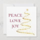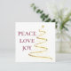 Una tarjeta de vacaciones clásica de doble cara con colores de ciruela, oro y blanco. La parte delantera presenta un árbol de Navidad dorado y abstracto con Peace Love Joy en un rojo profundo tradicional. El lado inverso tiene un mensaje de vacaciones en un tipo de letra blanco clásico que puede ser personalizado para satisfacer sus necesidades. Rótulo con los nombres de tu familia.
