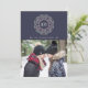 Moda y alegre diseño presenta "JOY" rodeado por una corona de marfil, arándanos y verde salvia, sobre un fondo azul oscuro para un hermoso contraste. Añade tu foto familiar favorita y personaliza con tu apellido y el año. Para ajustar el espaciado de saludo, nombre y año, utilice la función "Personalizar it" para mover elementos. ¡Una elección única y elegante para sus saludos de vacaciones!