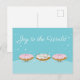 Postal que muestra donuts sonrientes. Las tres donuts están congeladas y decoradas con espolvorines. Pero, como los Navidades están llegando, la caída en el medio la ha llevado al siguiente nivel. Está decorado con rocas rojas, verdes y blancas salpicaduras y luces de Navidad para celebrar la fiesta. Los otros dos donuts están muy impresionados. ¡Creo que estás viendo el inicio de una nueva moda burda! La frase "Alegría al mundo" puede ser personalizada como quieras.